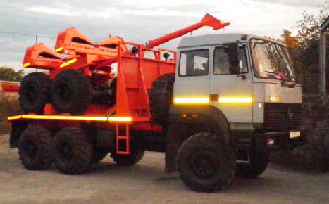 Предприятие ООО "Уралпромтехника" изготовило и представило на выставке новый образец спецтехники автомобиль - тягач 596027 и прицеп - роспуск 904703-27.